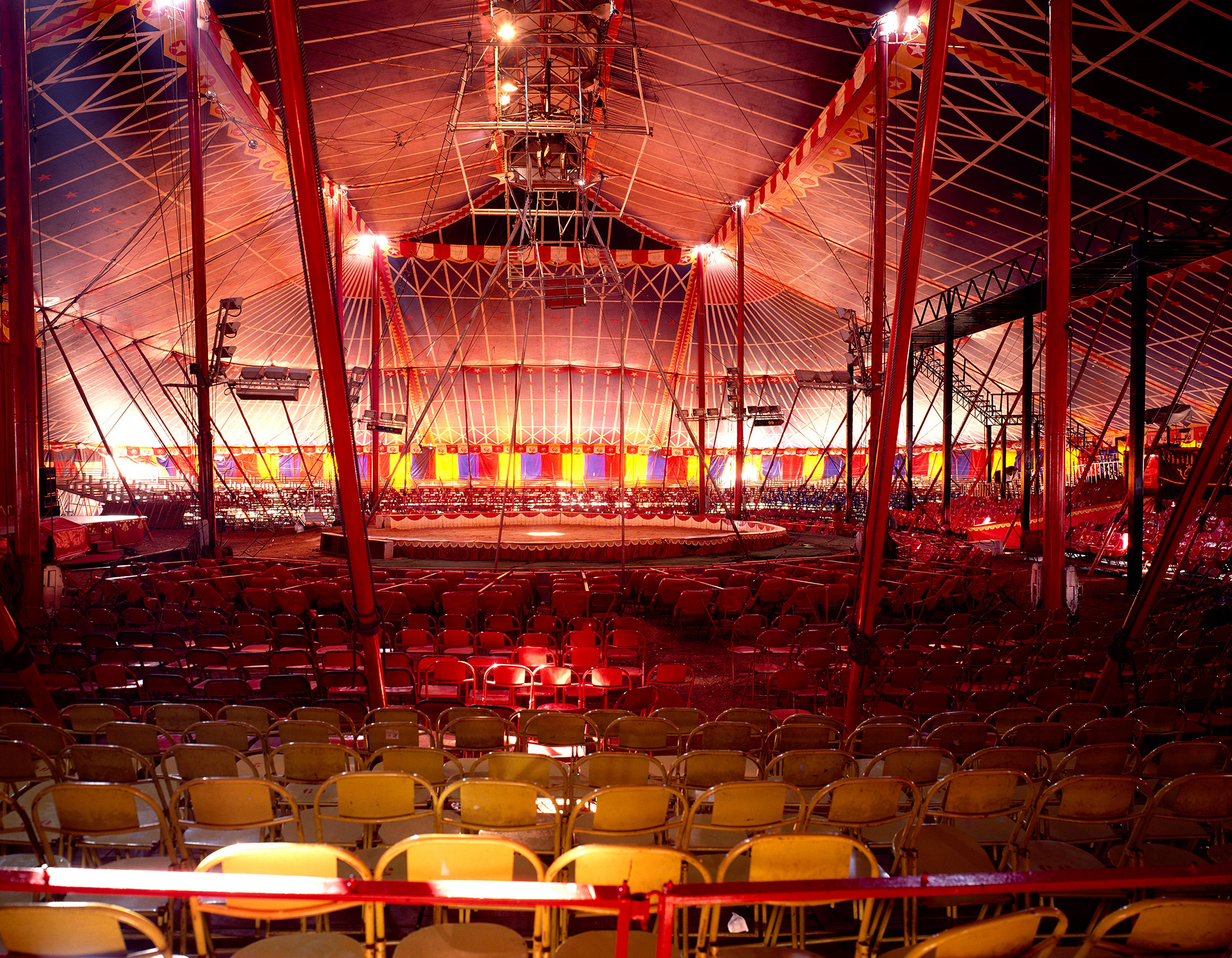 View of the circus ring before one of the shows. Third and fourth pictures portray the reception team at work and backstage.